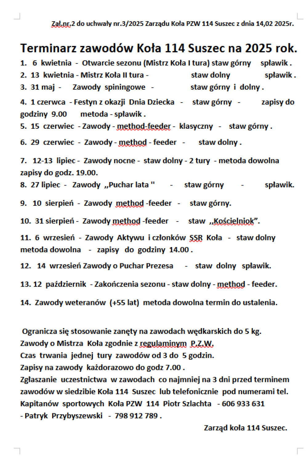 Spławikowe zawody „WIOSNA” 2026 r.